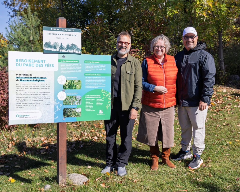 Un nouveau panneau d’interprétation au parc des Fées Partager Accueil Actualités Un nouveau panneau d'interprétation au parc des Fées 21 octobre 2025 Actualité / Nouvelle La Ville vient d’inaugurer un nouveau panneau d’interprétation au parc des Fées, où une plantation de 165 arbres et arbrisseaux de 17 espèces indigènes avait été réalisée en 2022. Marc-André Guertin, maire de Mont-Saint-Hilaire, Sylvie Caron, présidente du conseil d’administration de la Caisse de Beloeil-Mont-Saint-Hilaire et Mario Aylwin, directeur général de la Caisse de Beloeil-Mont-Saint-Hilaire. Le nouveau panneau explique notamment le processus de conception de cette nouvelle forêt urbaine, où les insectes, les plantes et les animaux ont encore plus d’espace pour s’épanouir! Ce secteur du parc était tout indiqué pour un projet de reboisement, comme il était déjà inclus dans la réserve naturelle du Piémont. Situer le parc des Fées sur Google Merci à la Caisse Desjardins de Beloeil-Mont-Saint-Hilaire grâce à qui le reboisement du parc des Fées a été rendu possible!