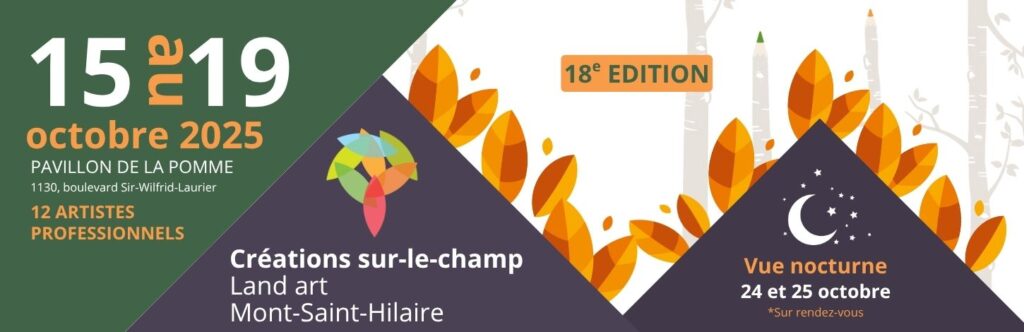 La Ville de Mont-Saint-Hilaire, en collaboration avec la directrice artistique Madame Jérémie Boudreault, est fière de présenter pour une dix-huitième année consécutive l’événement culturel phare de l’automne : Créations sur-le-champ / Land art Mont-Saint-Hilaire.