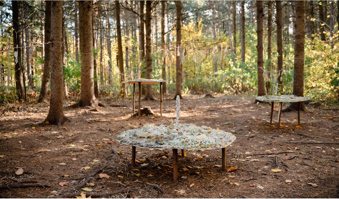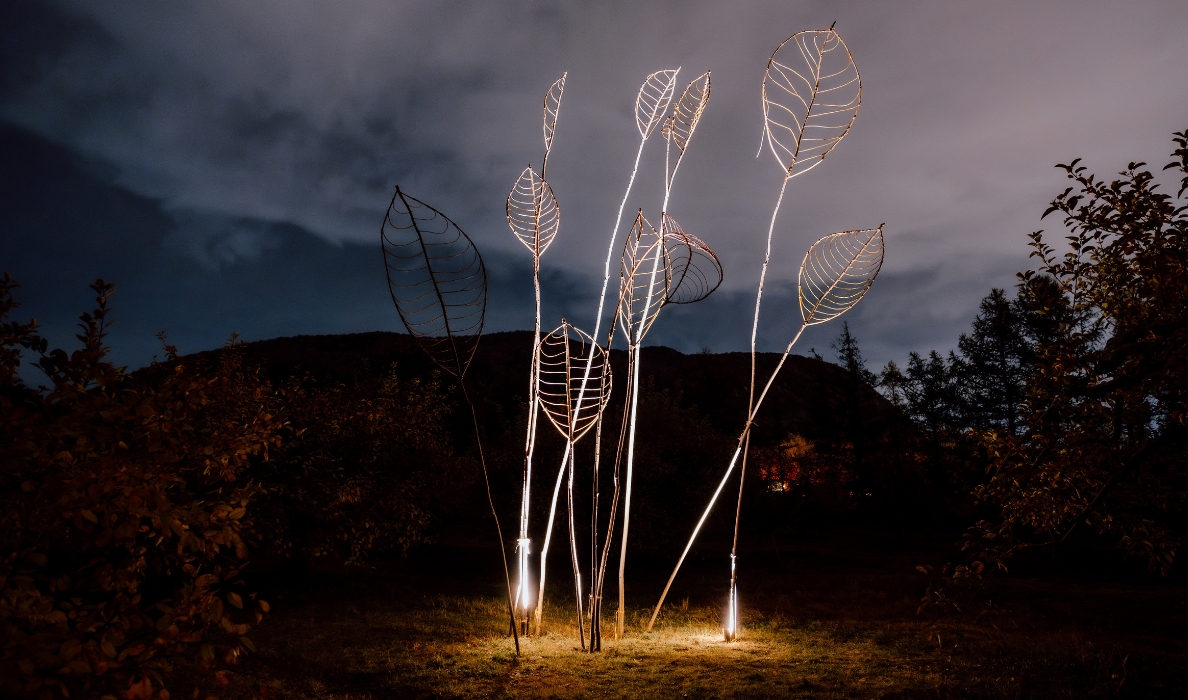 Le jury a décerné son prix à l’artiste hilairemontais Michel Leclerc pour son œuvre Sous-bois sous tension, accompagnée d’une bourse de 1 000 $. Cette installation, composée de grandes feuilles sur tiges, se distingue par sa délicatesse et sa maîtrise formelle. Elle capte le regard tout en s’opposant à la force de la montagne en arrière-plan. Par son échelle et sa thématique enracinée dans le territoire, elle s’intègre harmonieusement à l’environnement naturel.
