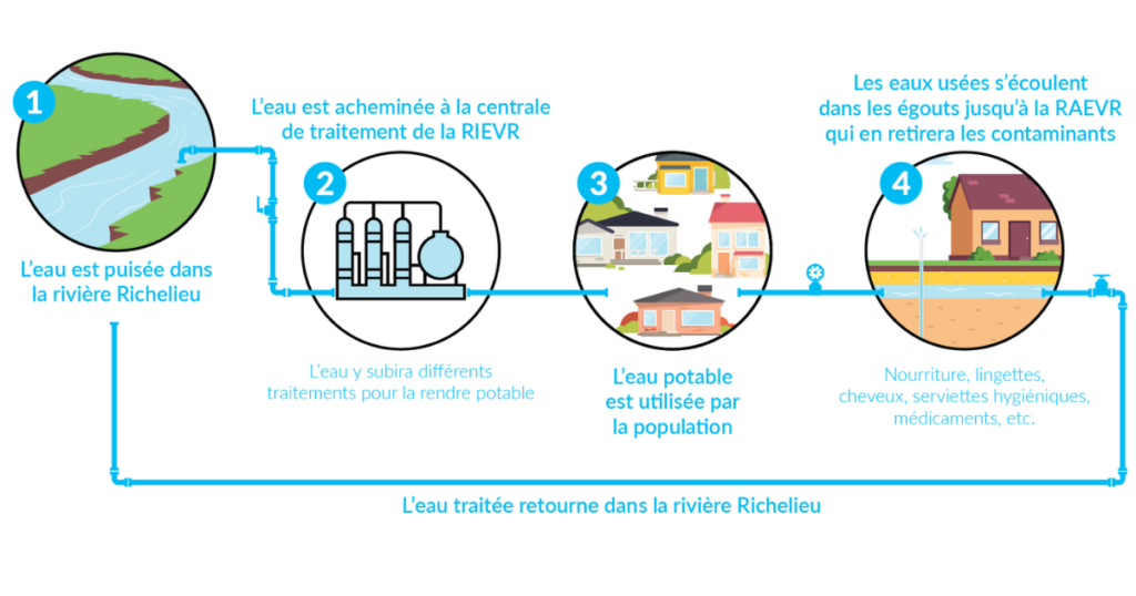 Les eaux usées qui partent de votre maison se rendent à l’usine de la Régie d’assainissement des eaux de la Vallée du Richelieu (RAEVR). Chaque année, la RAEVR produit un bilan sur la qualité de l’eau potable. Ce dernier est disponible sur le site de la Régie.
