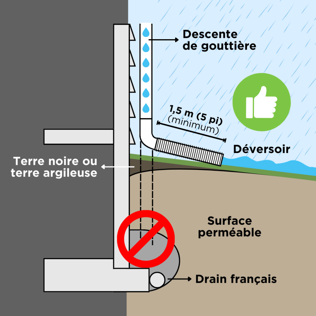 • Utiliser un déflecteur ou un tuyau déflecteur permettant le rejet des eaux de pluie à une distance de 1,5 mètres de la fondation de la maison afin d’éviter une percolation vers le drain percolant;