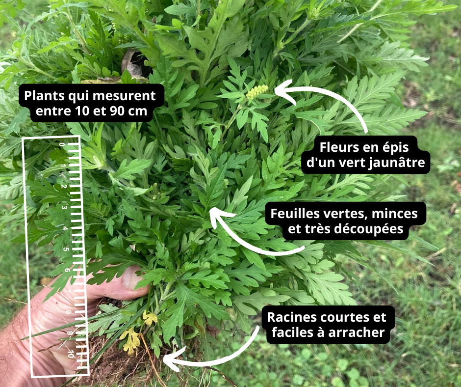 L’herbe à poux est une plante vivace envahissante. Ses grains de pollen qui voyagent dans l’air causent le rhume des foins chez les personnes allergiques. Au Québec, une personne sur huit en souffre!
